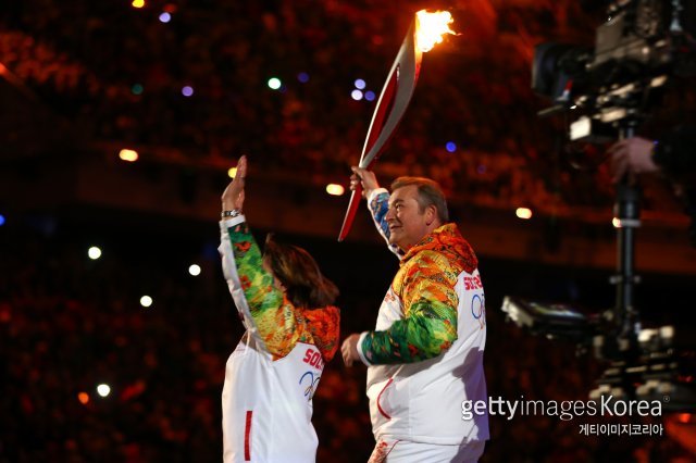 2014 소치올림픽 최종 성화 주자 블라디슬라프 트레티아크(오른쪽)-이리나 로드리나. 사진=게티이미지코리아