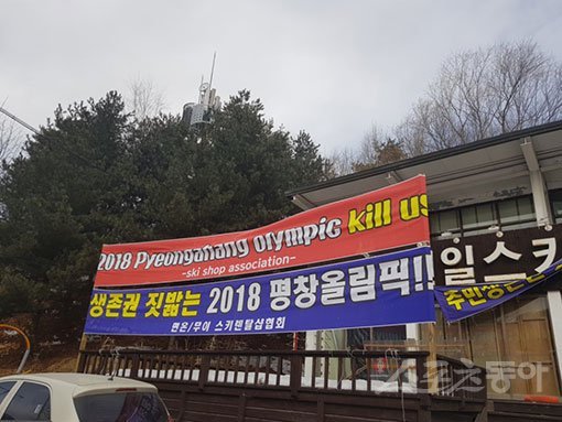 스노보드와 프리스타일 스키 모굴 경기가 열리는 휘닉스파크 인근 스키, 보드 장비 대여업체는 대회 중 리조트의 영업 중지에 따라 한 철 장사를 망쳤다. 별다른 보상을 받지 못한데 대한 절박한 마음이 곳곳에 걸려있는 현수막에 담겨 있다. 평창 | 장은상 기자 award@donga.com 대여업체 월드스키 임종천 사장은 “우리는 겨울 스키 시즌에 한 해 수입을 벌어서 산다. 지난해와 비교해 매출이 20% 이하로 줄어들었다. 절박한 상황이다. 더 답답한 것은 아무도 우리의 목소리를 들어주지 않는다는 점”이라고 말했다.