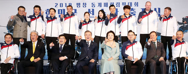 문재인 대통령과 김정숙 여사(앞줄 왼쪽에서 네 번째부터)가 2일 서울 세종문화회관에서 열린 2018 평창 겨울패럴림픽대회 출정식에서 선수단과 함께 ‘가즈아∼’를 외치고 있다. 현직 대통령이 패럴림픽 출정식에 참가한 것은 처음이다. 선수단 등 약 180명이 참석했다. 문 대통령은 “여러분은 이미 금메달이다. 인생의 시련을 이겨낸 챔피언이다”라고 격려했다. 한국은 9일 개막하는 이번 대회 6개 전 종목(바이애슬론, 스노보드, 아이스하키, 알파인스키, 크로스컨트리스키, 컬링)에 36명의 선수가 나선다. 첫 금메달과 종합 10위를 목표로 하고 있다.