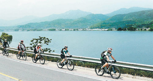 경기 양평 양수리 한강변을 달리는 인터넷 동호회 아마추어 자전거 여행자 모임 회원들. 강물은 초록 잔주름으로 일렁이고, 강 너머 두물머리 서북쪽 운길산 능선들이 아슴아슴하다. 길가엔 노란 애기똥풀꽃과 진홍 철쭉꽃이 지천이다. 자전거는 길을 둥글게 말면서 나아간다. “차르르 또도로르르.” 자전거는 바람에 날리는, 향기로운 아까시꽃이다. 양평=서영수전문 기자