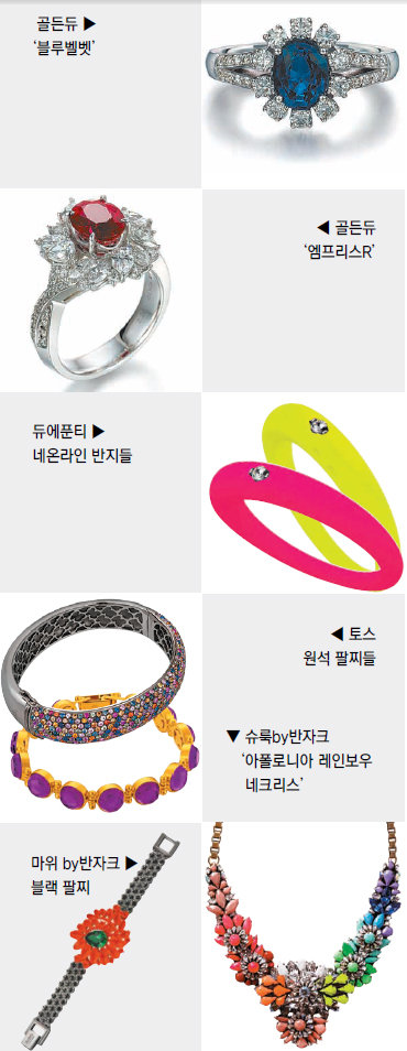 당신의 보석함에는 화이트 골드, 다이아, 골드 네크리스 일색의 ‘무난한’ 액세서리들뿐인가? 그렇다면 이젠 화려한 유색 주얼리로도 눈을 돌려보자.