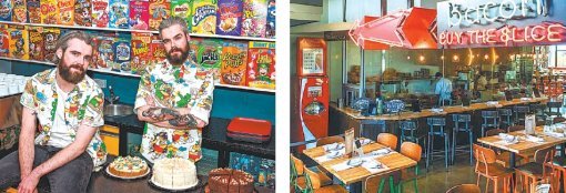 ‘시리얼 킬러 카페’의 쌍둥이 형제 주인(왼쪽 사진). 시리얼만 100여 종을 파는 이 카페는 최근 영국 버밍엄에도 진출했다. 미국 캘리포니아 주의 ‘베이컨 바’는 다양한 맛을 내는 베이컨을 내놓는다. 바앤다이닝 제공