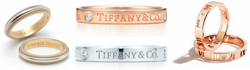 티파니 밴드 링 중에서도 가장 많은 사랑을 받는 제품은 단연 ‘밀그레인 링’이다. 플래티늄이나 18K 골드 밴드에 낱알 모양으로 세공한 섬세한 밀그레인 디자인이 남녀 모두에게 무난하게 어울린다. 티파니 로고와 함께 다이아몬드가 박힌 ‘TCO 밴드 링’도 연인들을 설레게 하는 제품이다. 플래티넘과 로즈골드 밴드 중에서 선택할 수 있다. 지난해 말 출시한 ‘아틀라스 피어스드 링’도 주목할 만하다. 로마숫자가 새겨진 독특한 디자인이 젊은 커플들로부터 좋은 반응을 얻고 있다. 티파니에서는 밴드 링을 구매하는 고객들을 위해 반지 안쪽에 이니셜이나 원하는 메시지를 새겨준다.