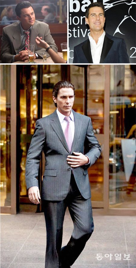 조르조 아르마니는 여러 영화의 남자 주인공에게 의상을 제공했다. 대표적인 예가 ‘더 울프 오브 월스트리트’의 리어나도 디캐프리오(위 왼쪽·영화 속 장면), ‘미션 임파서블 고스트 프로토콜’의 톰 크루즈(위 오른쪽), ‘다크 나이트 라이즈’의 크리스천 베일(아래 큰 사진·영화 속 장면)이다. 신세계인터내셔날 제공