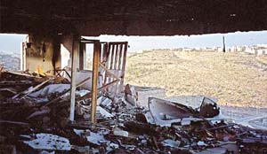 요르단강 서안의 팔레스타인 도시 벳잘라에서 이스라엘군의 공격을 받아 완파된 팔레스타인인 거주 주택. 부서진 외벽 사이로 두 달 가까이 벳잘라와 총격전을 벌인 유대인 정착촌 질로(오른쪽 위)의 모습이 보인다.
