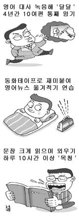 99년 군에서 제대한 뒤 한 영어학원 강사가 권하는대로 ‘문장 따라 읽으며 외우기’ 연습을 서너달 한 뒤부터 조금씩 자신이 생겼다. 그는 “틈만 나면 빈 강의실에 앉아 큰 소리로 영어를 읽는 연습을 했다”며 “아직도 깊이 있는 주제는 어렵지만 웬만한 대화는 영어로 충분히 가능하다”고 말했다.