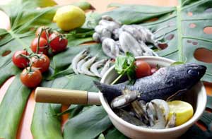 생선 2마리(생태, 농어, 우럭 등등), 기타 해물류(조개, 새우 등등) 1㎏, 양파 1개, 피망 1개, 마늘 2톨, 대파 50g, 고춧가루 1큰술, 올리브유 4큰술, 월계수잎 1∼2장, 토마토 200g, 생선 육수 1컵, 물 약간, 화이트와인 또는 럼주 약간, 바질잎 4장.
