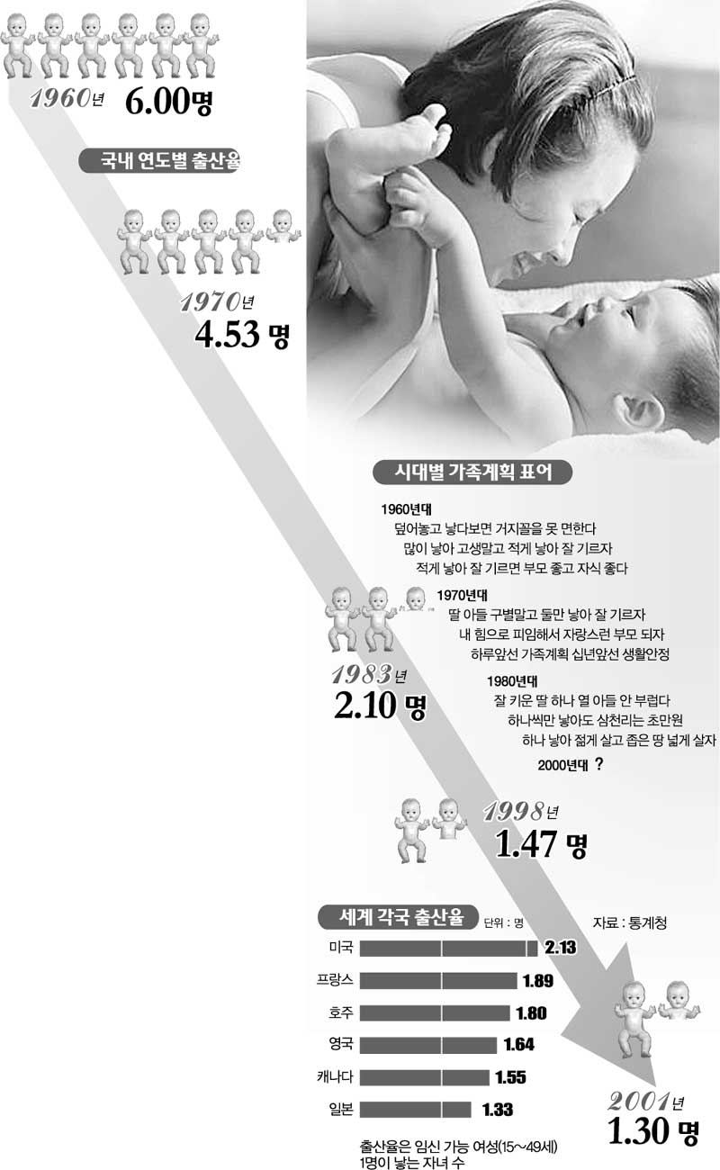 자녀를 적게 낳는 추세가 완전히 정착되고 있다. 1960년대에 6.0명이던 국내 출산율(15∼49세의 임신 가능 여성이 낳는 자녀 수)이 지난해에는 세계적으로 가장 낮은 수준인 1.3명으로 떨어졌다.