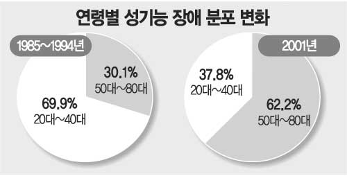 중앙대 용산병원 비뇨기과 김세철 교수팀이 성기능 문제로 병원을 찾은 환자를 연령별로 분석한 결과 1985∼94년에는 30대, 20대, 40대, 50대, 60대, 70대 순으로 많았지만 2001년에는 50대, 60대, 40대, 30대, 70대, 20대 순으로 바뀌었다.