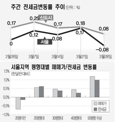 강북권에서는 마포구(0.43%)와 중구(0.27%)가 비교적 많이 올랐다. 마포구의 경우 월세 물량만 나와 있어 전세물이 나오면 즉시 거래가 이뤄진다. 마포구 공덕동 삼성1차 34평형이 500만원 올라 2억∼2억 3000만원에 거래됐다.