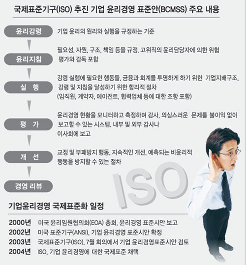 국제표준기구(ISO)와 미국 920개 기업들로 구성된 윤리임원협의회(EOA)는 기업의 ‘윤리경영 표준안(BCMSS)’을 2년 안에 국제 표준화하는 작업을 추진하고 있다. 이 표준안은 △기업이 윤리강령을 갖추고 △윤리담당자를 두며 △윤리교육을 실시하고 △내부부정 적발 시스템을 마련하는 것 등을 뼈대로 한다. 국제표준이 채택되면 세계 각국의 주요 기업들은 윤리경영 시스템을 갖추도록 사회적 압력을 받을 것으로 예상된다. ‘기업윤리 라운드’가 시작되는 것이다.