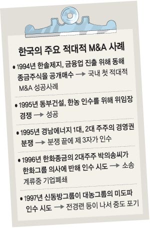 ▽한국의 적대적 M&A=한국에서 적대적 M&A 시장이 열린 것은 외환위기 이후 대주주의 경영권을 보호해온 증권거래법 200조(일반인이 특정 상장기업의 주식을 10% 이상 소유할 수 없도록 한 규정)가 폐지되고 외국인에 의한 M&A가 전면 허용된 이후. 지금은 많은 대형 법률회사가 M&A로 돈을 벌고 한국M&A, 프런티어CRC 등 독립 중개업체(부티크)들도 많이 생겼다. 그러나 대개 부실기업의 매각을 도와주고 기업 분할과 합병에 대한 자문에 응하는 등 우호적 M&A사업이 대부분이다.