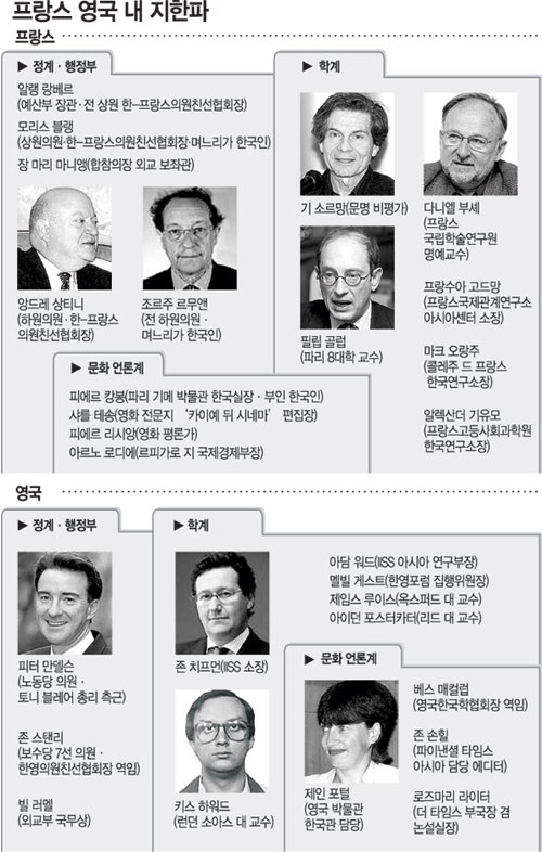 영국은 북아일랜드 장관을 지낸 피터 만델슨 노동당 의원이 지한파 실력자로 꼽힌다. 토니 블레어 총리의 측근으로 지난해 말 한국을 방문, 노무현(盧武鉉) 대통령당선자에게 블레어 총리의 친서를 전달하기도 했다. 야당인 보수당에서는 한영(韓英)의원친선협회장을 지낸 7선의 존 스탠리 의원이 알려진 지한 인사.