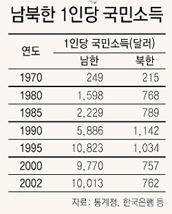 또 95년에는 그 격차가 처음으로 10배를 넘었다. 지난해에는 남한이 1만13달러, 북한이 762달러로 13.1배로 격차가 커졌다.
