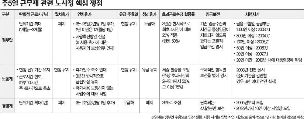 한국노총 관계자는 “전체 근로자의 56%에 달하는 760여만명이 20명 미만 영세 사업장에서 일하고 있다”며 “노동조합도 거의 결성돼 있지 않은 이들에게 주5일 근무제의 혜택을 주기 위해 시행시기를 대폭 앞당겨야 한다”고 주장했다.
