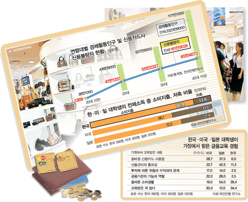 전국은행연합회에 따르면 7월 말 현재 신용카드 때문에 신용불량자로 등록된 161만9026명 가운데 20대와 30대의 비율은 각각 25.4%와 34.1%. 10명 중 6명은 ‘2030세대’란 뜻이다.