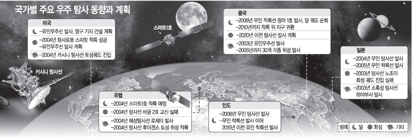 ▽중국-인도-일본 “우리도 보낸다”=중국은 유인우주선 선저우(神舟) 5호 발사 성공에 힘입어 달과 화성에 대한 탐사선 발사 계획을 잇달아 발표했다.