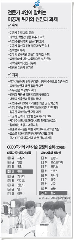 ▽국양 교수=보통 이공계 위기를 말할 때 수학능력시험 점수를 드는데 수능 점수가 학생들의 능력을 정확히 대변하는 건 아니죠. 다만 서울대 자연대와 공대의 경우 예전엔 아주 우수한 학생들이 50명 중 7, 8명은 있었는데 요즘은 피부로 느낄 만큼 줄었습니다. 그러나 이공계 위기가 과장돼 학생들이 이공계를 더욱 꺼리는 것도 문제입니다.