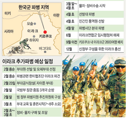정부는 파병동의안에 파병지를 ‘키르쿠크’로 못박지 않은 채 ‘이라크와 그 주변국’으로 명시해 경우에 따라선 일부 병력이 키르쿠크 이외의 지역에 주둔할 가능성도 무시할 수 없다.