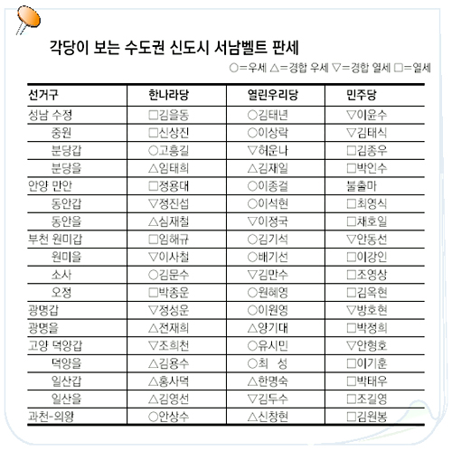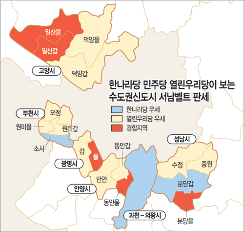 한나라당은 9일 △성남 분당갑, 부천 소사, 과천-의왕 등 3곳은 우세로 △성남 분당을, 안양 동안을, 광명을 등 6곳은 경합 우세로 △안양 동안갑, 부천 원미을 등 5곳은 경합 열세로 △성남 수정, 중원 등 5곳은 열세 지역으로 분류했다.