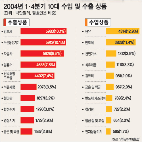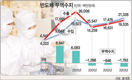 1988년부터 무역 흑자 효자품목으로 불리던 반도체는 고화질(HD) TV 등에 들어가는 시스템온칩(SoC) 등의 수입이 늘면서 2001년 5월부터 적자를 내고 있다.