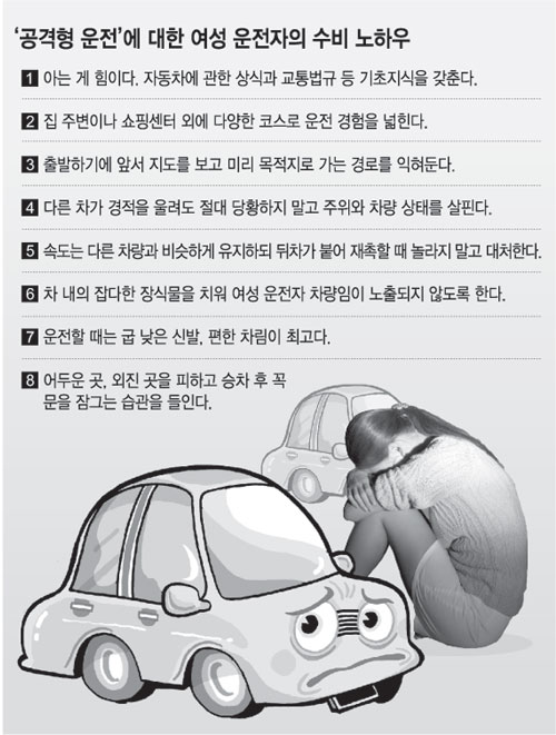 “앞차가 머뭇거릴 때 ‘노인 아니면 아줌마’라는 비아냥은 보통이죠. 앞차 운전자가 남자라면 그냥 지나칠 일도 여자임을 확인한 순간 차를 바싹 붙여가며 경적을 울리는 것은 점잖은 편이고, 삿대질에 욕설, 차 앞에 확 끼어들어 깜짝 놀라게 만드는 ‘보복’도 숱하게 당했죠.”