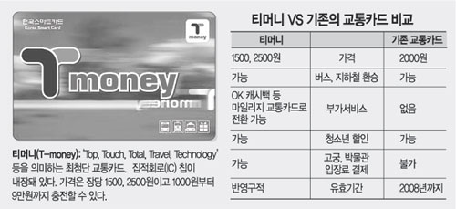 티머니는 버스와 지하철 교통카드 전용인 보급형(1500원)과 제휴업체 마일리지를 교통카드 요금으로 전환해 쓸 수 있는 고급형(2500원) 등 2개 종류가 나온다.