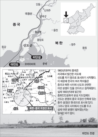 올해 1월 중국 지도출판사가 발간한 중국 전국지도에도 신도는 북한 땅으로 분류돼 있다. 의아한 것은 취재팀이 신도 일대를 돌아볼 때 북한 경비선을 발견할 수 없었다는 점. 비단섬 해안에서 경비를 서는 북한 군인도 찾아볼 수 없었다.