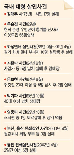 미국에서는 20여년 동안 48명을 살해한 ‘그린 리버 연쇄살인사건’의 범인이 지난해 법정에서 범행을 자백하기도 했다. 이에 앞서 1970년대엔 35명의 여성을 살해한 ‘테드 번디 사건’도 있었다. 영국에서는 1975년부터 1998년까지 환자 등 215명을 살해한 ‘죽음의 의사’ 헤럴드 시프먼이 2000년 종신형을 선고받은 뒤 올 1월 자살하기도 했다.
