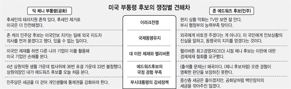 두 후보는 세금문제에선 극명한 시각차를 드러냈다. 체니 부통령은 “개인의 돈은 개인이 써야 한다. 국가가 세금을 거둬가며 개인생활에 개입해선 안 된다”고 ‘작은 정부론’을 폈다.