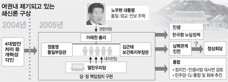열린우리당 내에서는 ‘민생’과 ‘통합’으로의 기조변화가 불가피하다는 의견이 대세다. 얼마 전 노 대통령을 면담했던 당내 한 핵심인사도 “대통령이 자신에 대한 저평가에 대해 매우 억울해하더라”며 “그러나 변화의 필요성에 대해서는 분명한 인식을 가지고 있다”고 말했다.