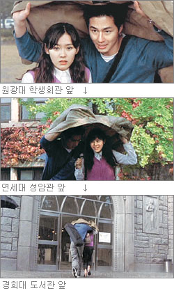 소나기가 퍼붓자 우산이 없어 근처 나무 아래로 들어간 지혜는 상민을 만나고, 두 사람은 상민의 재킷을 함께 덮어쓰고 도서관까지 달린다. 사실 이 ‘빗속 질주’ 장면은 유명 캠퍼스의 명소를 짜깁기해 찍은 것이다. 지혜와 상민이 만나 달리기 시작하는 곳은 전북 익산의 원광대 학생회관 앞이다. 두 사람은 서울 서대문구 신촌동 연세대 연희관 현관에서 잠시 숨을 고르다가, 연세대 성암관(영상대학원)으로 들어가고, 서울 동대문구 회기동에 있는 경희대 서울캠퍼스의 도서관에서 헤어진다.