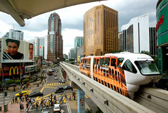 서울 강남구와 영등포구가 새로운 대중교통수단으로 모노레일 설치를 추진키로 해 그 귀추에 관심이 쏠리고 있다. 사진은 말레이시아 쿠알라룸푸르 시내를 달리는 모노레일. 동아일보 자료 사진