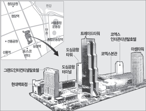 영화에서 추격전이 벌어지는 코엑스몰의 지하통로는 미로처럼 복잡하다. 아셈타워, 인터컨티넨탈호텔, 현대백화점 무역센터점 등 이 일대 11개 주요 건물과 이어져 있다. 영화에서 유진이 신기해 하며 디지털카메라로 사진을 찍는 특이한 외양의 건물은 포스코 사거리 옆에 있는 동부금융센터. 거대한 역삼각형과 배불뚝이 구조가 강한 인상을 남기는 건물이다.