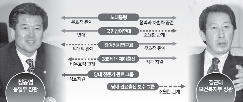 하지만 2002년 대선 이후 그는 노 대통령과 끈끈한 인간적 관계를 맺어 왔다. 참여정치연구회를 제외한 국민참여연대와 기존 ‘노무현을 사랑하는 사람들의 모임(노사모)’ 조직과도 우호적이다. 이들은 당내에서 뚜렷한 개혁성향을 보이고 있다. 정 장관 캠프는 좌로는 노 대통령과 노사모 조직을, 우로는 정 장관 개인 성향에 바탕을 둔 당내 중도보수그룹을 아우르는 ‘양 날개 전략’을 펴고 있다. 지금까지는 비교적 성공적으로 상호 이질적인 양대 세력을 관리하고 있다. 개혁적 이미지와 보수적 정책노선도 유연하게 활용하며 어느 한쪽에 지나치게 치우치지 않는 균형감각을 나름대로 보이고 있다.