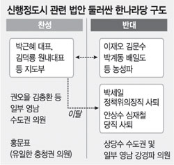 《2일 국회 본회의에서 신행정도시 법안 처리를 놓고 한나라당은 둘로 갈라졌다. 당내 비주류 및 수도권 의원들은 이날 저녁 본회의 진행을 막기 위한 실력행사에 나섰지만 박근혜(朴槿惠) 대표 등 지도부는 본회의 표결에 참여했다. ‘행정도시 이전’의 후폭풍이 한나라당에 휘몰아칠 태세다.》