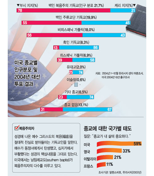 전체 기독교도 중 부시 대통령을 지지한 사람은 59%로 절반을 조금 넘는 정도였지만, 성서의 무오류를 확신하는 복음주의 기독교도는 무려 78%가 부시 대통령에게 몰표를 던졌다. 지난해 공화당원으로 신규 유권자 등록을 한 400만∼500만 명 가운데 대다수가 복음주의 기독교도라는 분석이 나올 정도다.