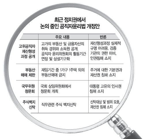▽문제점=의원들이 제각각 내놓고 있는 개정안은 당장 실현가능성 및 기본권 침해 여부로 논란을 빚을 전망이다. 고위 공직자들이 고급 정보를 부당하게 이용해 재산을 늘리는 것을 막기 위해 여야가 총선 공약으로 내걸었던 ‘주식 백지신탁제도’가 재산권 침해 논란 끝에 흐지부지된 전례가 있다.