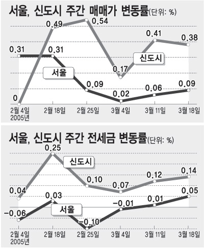 신도시는 모두 오름세를 보였다. 특히 재건축이 본격화되는 과천주공 3단지의 이주가 시작되면서 인근 군포시 산본(0.31%)과 안양시 평촌(0.17%)이 강세를 보였다.