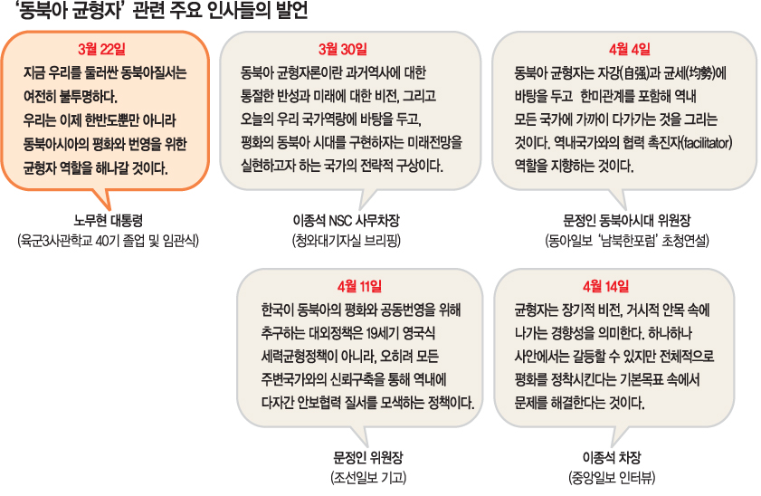 문정인(文正仁) 대통령 자문 동북아시대위원장과 이종석(李鍾奭) 국가안전보장회의(NSC) 사무차장은 일부 언론과의 인터뷰 등을 통해 ‘균형자’ 개념을 적극적으로 설명하고 나섰다.