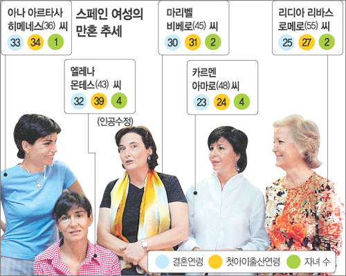 지난달 마드리드에서 국제적십자사 주선으로 30∼50대 여성 5명과 그룹 인터뷰를 한 결과 결혼연령과 첫 아이 출산연령이 젊은 세대로 올수록 늦어졌다. 5명 중 40대 중반 이후인 여성 3명의 공통점은 20대에 결혼했고 자녀가 둘 이상이며 직장에 다니는 동안 입주 도우미, 혹은 친정부모가 자녀를 돌봐줬다는 것.