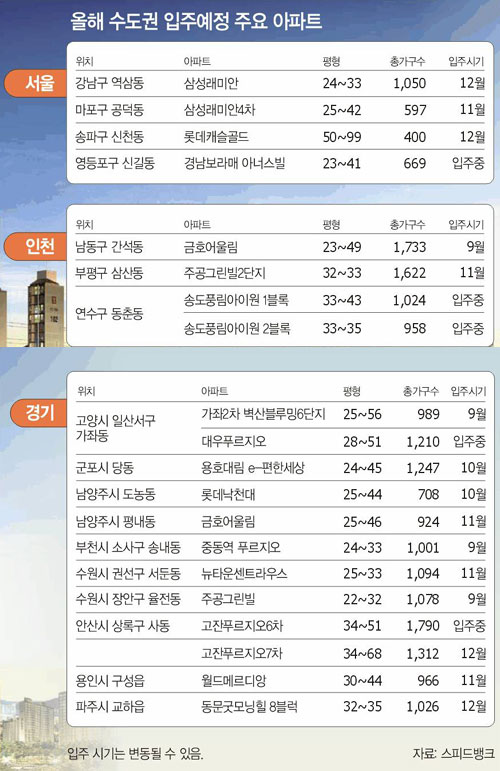 부동산정보 제공업체인 스피드뱅크에 따르면 올해 하반기 서울·경기·인천 지역에서 주상복합아파트를 포함한 입주아파트는 총 252개 단지 8만3263가구다.
