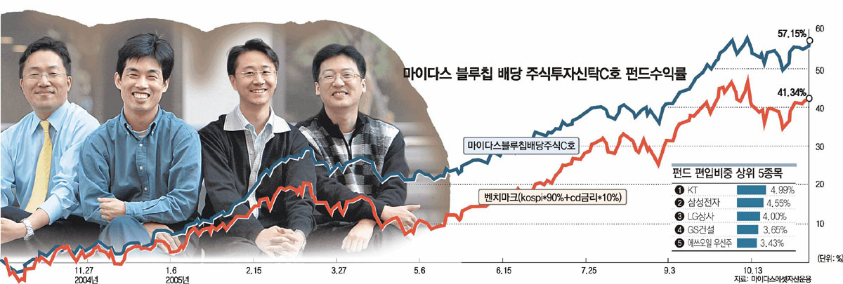펀드 운용 책임자인 마이다스에셋자산운용 허필석 이사는 “중소형주 위주의 배당 펀드보다 배당수익률이 0.5∼1%포인트 낮지만 유동성이 풍부하고 상대적으로 성장성이 높은 것이 이 펀드의 강점”이라고 설명했다.
