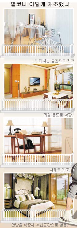 《이르면 다음 달 초부터 주택 발코니를 방이나 거실로 개조해 사용하는 것이 합법화된다. 이미 발코니를 개조해 사용하고 있는 아파트도 화재 및 안전 관련 장치를 보완하면 인정받을 수 있게 된다. 발코니를 개조하면 33평형(전용면적 25.7평) 아파트를 기준으로 실내 이용면적이 5∼10평 늘어날 수 있다. 즉 40평형대 아파트에 못지않게 널찍한 실내공간을 가질 수 있다는 얘기다. 이런 이유로 발코니 개조가 활발하게 이뤄지리라는 기대감이 많다. 관련 업계는 이미 시장 선점을 위한 치열한 경쟁을 벌일 정도. 하지만 발코니를 무턱대고 방이나 거실로 개조했다가는 큰코다치기 십상이다. 난방시설 설치나 단열처리를 제대로 하지 않으면 겨울에 춥고, 바닥이나 벽지가 썩는 일도 생길 수 있기 때문이다.》