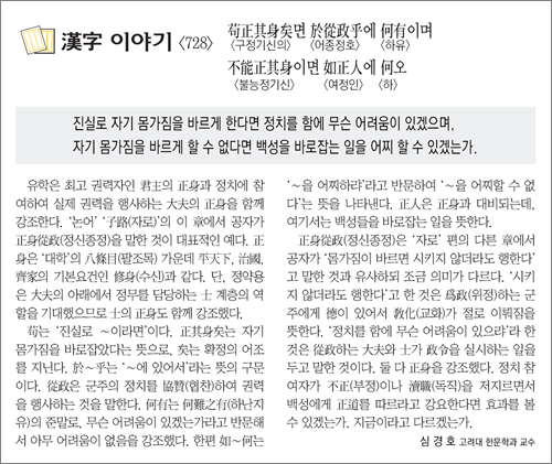 正身從政(정신종정)은 ‘자로’ 편의 다른 章에서 공자가 ‘몸가짐이 바르면 시키지 않더라도 행한다’고 말한 것과 유사하되 조금 의미가 다르다. ‘시키지 않더라도 행한다’고 한 것은 爲政(위정)하는 군주에게 德이 있어서 敎化(교화)가 절로 이뤄짐을 뜻한다. ‘정치를 함에 무슨 어려움이 있으랴’라 한 것은 從政하는 大夫와 士가 政令을 실시하는 일을 두고 말한 것이다. 둘 다 正身을 강조했다. 정치 참여자가 不正(부정)이나 瀆職(독직)을 저지르면서 백성에게 正道를 따르라고 강요한다면 효과를 볼 수 있겠는가. 지금이라고 다르겠는가.