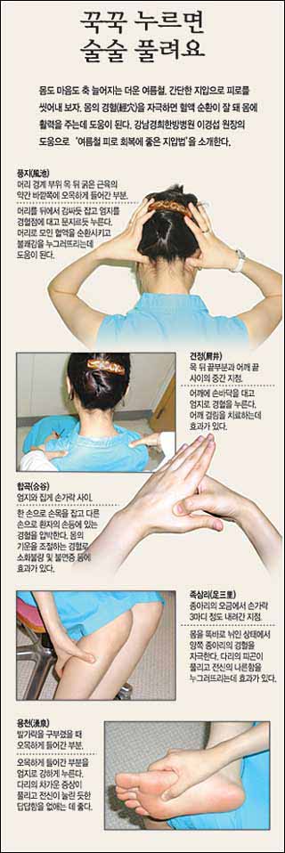 ▽피로를 예방하려면〓피로 예방법의 으뜸은 충분한 휴식. 특히 숙면만큼 중요한 휴식도 없다. 날이 더울 때는 평소보다 30분 정도 일찍 잠자리에 들면 피로 회복과 예방에 도움이 된다. 단 생활 리듬을 깨뜨리지 않기 위해서는 늦게 일어나는 것보다는 일찍 잠자리에 드는 게 좋다.