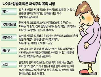 ▽채식주의 유의점〓고섬유질 저지방의 채식주의 식단이 모든 사람에게 도움이 되는 것은 아니다. 육류에 풍부한 단백질과 필수 아미노산, 칼슘 철분 등은 채소에 거의 없거나 부족해 채식만으로는 영양 결핍을 초래할 수 있기 때문.