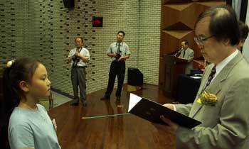 김학준 동아일보사장이 제24회 전국학생과학발명품 경진대회에서 금상을 수상한 이권민양(12·경기 일죽초 4년)에게 상장을 주고 있다. - 대전=이기진기자