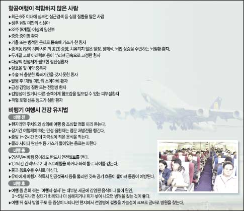 이밖에 평소 심부전 협심증 고혈압 등 심혈관계 질환이나 천식 폐질환 등 호흡기 질환을 가진 사람은 기내 환경 때문에 증세가 악화될 수 있다.