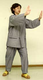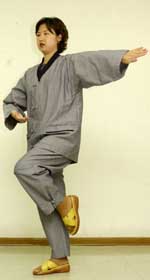◁ 폐(肺)에 도움을 준다. 숨을 들이마시면서 한쪽 팔과 같은 쪽 발을 앞으로 내밀고 다른 손은 옆에 붙여 활 쏘는 자세를 취한다. 손을 바꾸면서 숨을 내쉰다.